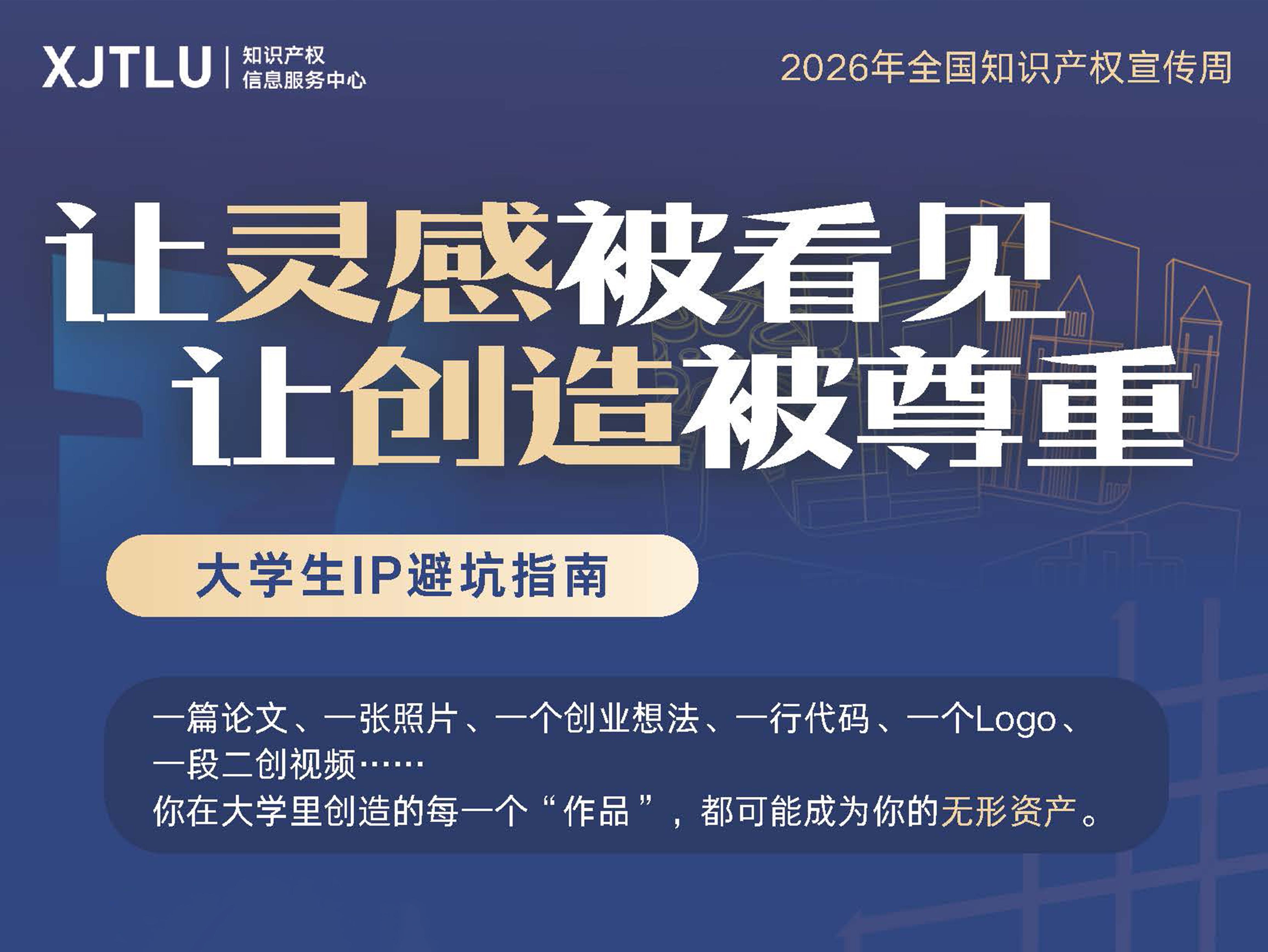 在数字创新与人工智能快速发展的背景下,知识产权已深度融入大学生学习研究、内容创作与创新创业实践之中。为迎接2026年全国知识产权宣传周,西交利物浦大学知识产权信息服务中心(IPISC)推出展览 “让灵感被看见,让创造被尊重——大学生IP避坑指南”。本次展览精选十个与大学生密切相关的知识产权典型议题,通过“知识点 + 案例故事 + 温馨提示”的形式,聚焦科研成果保护、版权使用边界、AI内容权属、软件与商标保护、创业项目风险防范等内容,帮助师生识别常见知识产权风险,提升知识产权保护意识与创新成果保护能力。