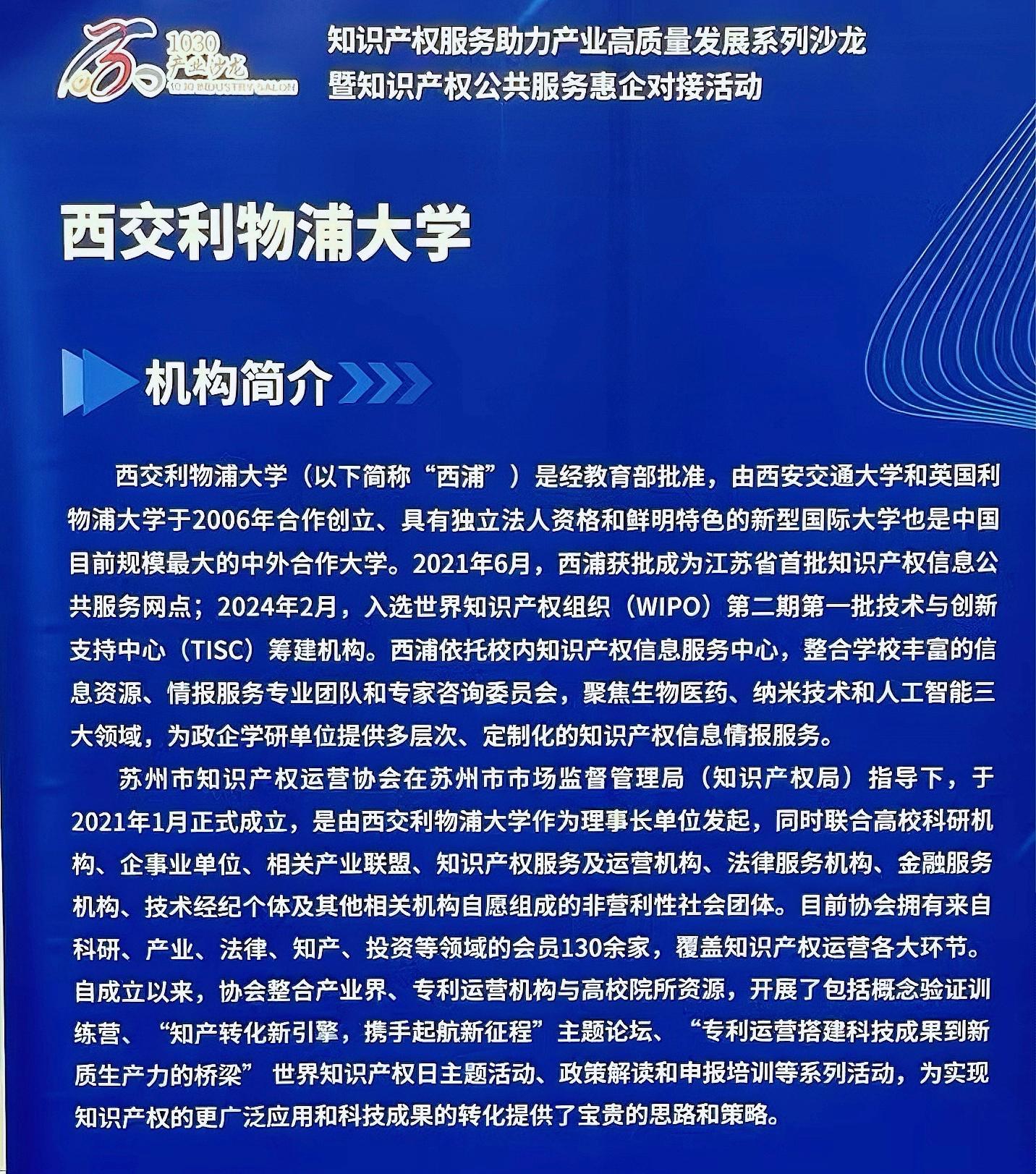 西交利物浦大学知识产权信息服务中心参会,依托高校科研与人才优势,提供知识产权信息咨询、技术成果对接、专业人才支撑,助力政企研资源高效联动。
